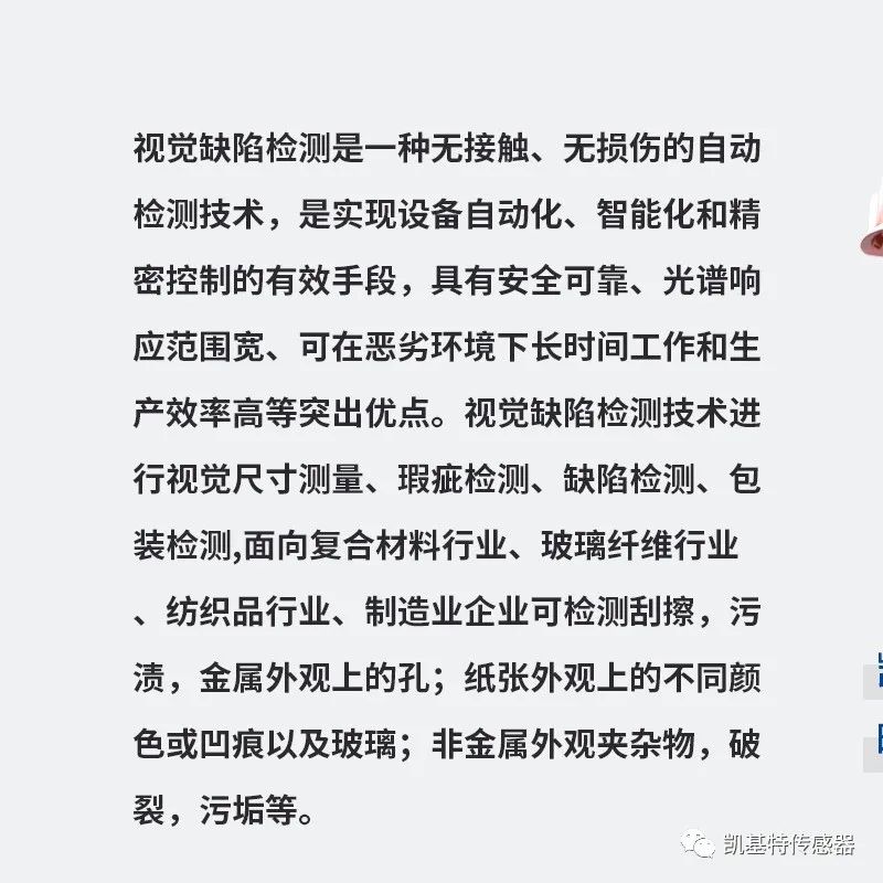 視覺(jué)缺陷檢測(cè)是一種無(wú)接觸、無(wú)損傷的自動(dòng)檢測(cè)技術(shù),是實(shí)現(xiàn)設(shè)備自動(dòng)化、智能化和精密控制的有效手段,具有安全可靠、光譜響應(yīng)范圍寬、可在惡劣環(huán)境下長(zhǎng)時(shí)間工作和生產(chǎn)效率高等突出優(yōu)點(diǎn)。視覺(jué)缺陷檢測(cè)技術(shù)進(jìn)行視覺(jué)尺寸測(cè)量、瑕疵檢測(cè)、缺陷檢測(cè)、包裝檢測(cè),面向復(fù)合材料行業(yè)、玻璃纖維行業(yè)、紡織品行業(yè)、制造業(yè)企業(yè)可檢測(cè)刮擦,污漬,金屬外觀上的孔;紙張外觀上的不同顏色或凹痕以及玻璃;非金屬外觀夾雜物,破裂,污垢等。