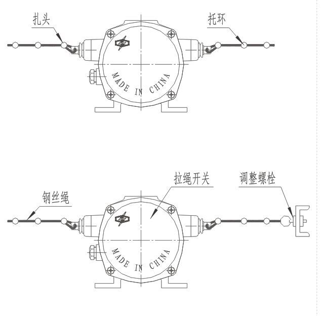 當(dāng)膠帶運(yùn)輸現(xiàn)場(chǎng)發(fā)生緊急事故時(shí),拉動(dòng)系在吊耳上的鋼絲繩,是機(jī)內(nèi)的滑塊與開關(guān)作用,發(fā)出停機(jī)信號(hào)。 松開鋼絲繩后開關(guān)自動(dòng)復(fù)位。